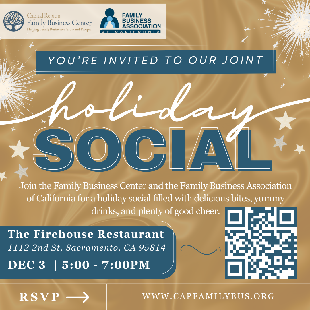 Join the Family Business Center and the Family Business Association of California for a holiday social filled with delicious bites, yummy drinks, and plenty of good cheer.